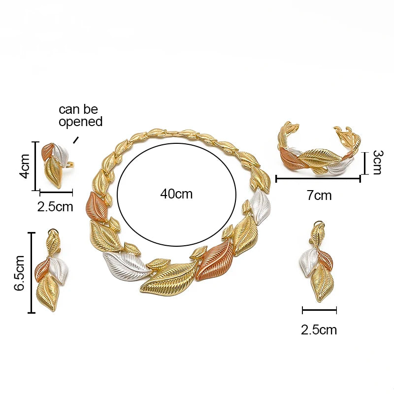 Shine with elegance wearing this Leaf Shaped Party Jewelry Set. Featuring a beautifully detailed necklace, matching earrings, and bracelet, it brings a touch of nature-inspired glamour to your style. Perfect for weddings, parties, or special evenings, this lightweight yet eye-catching set enhances any outfit effortlessly.
