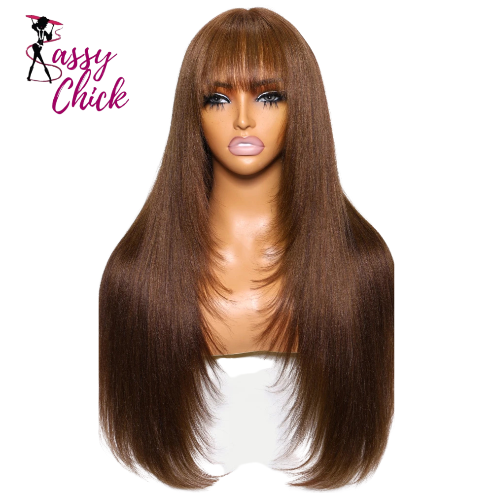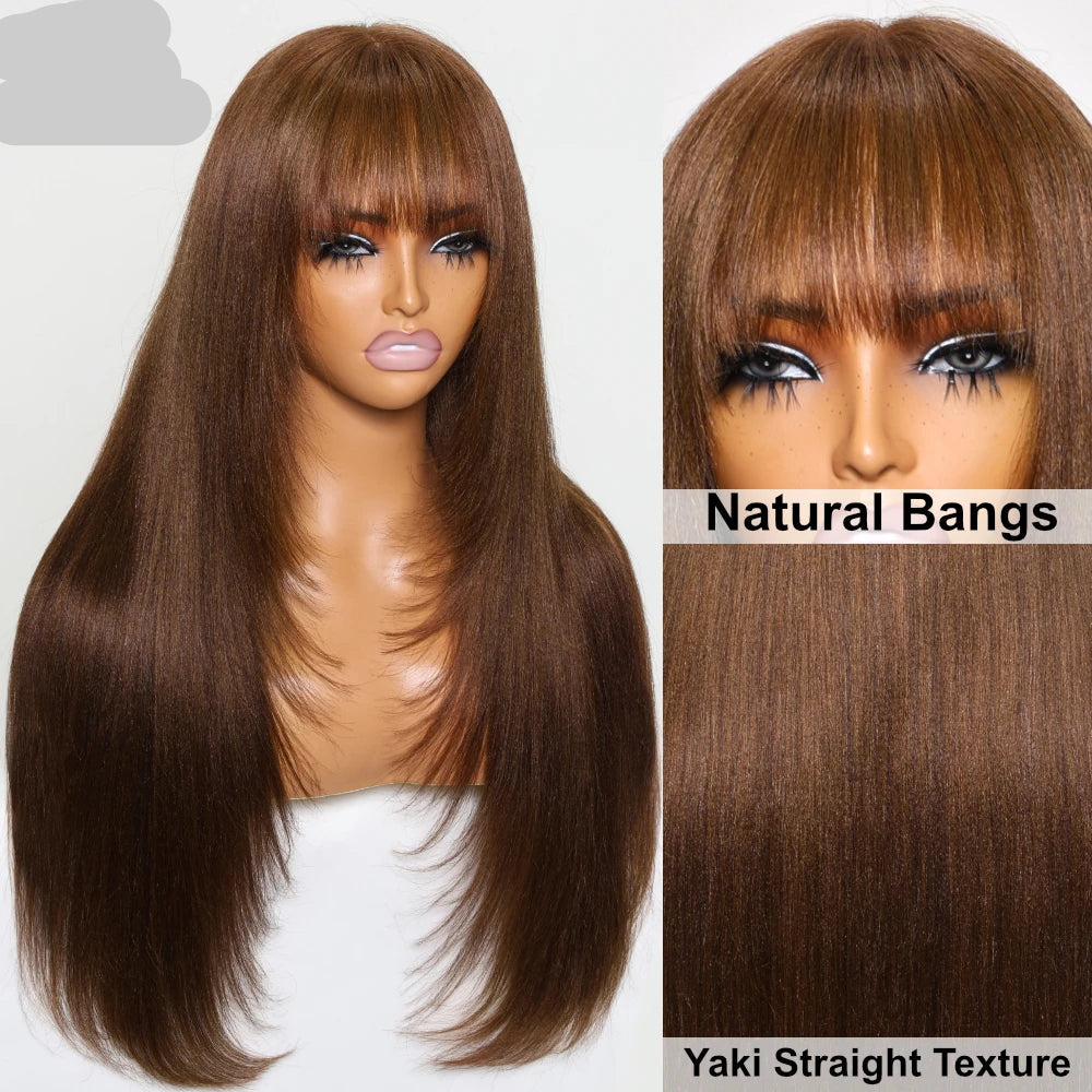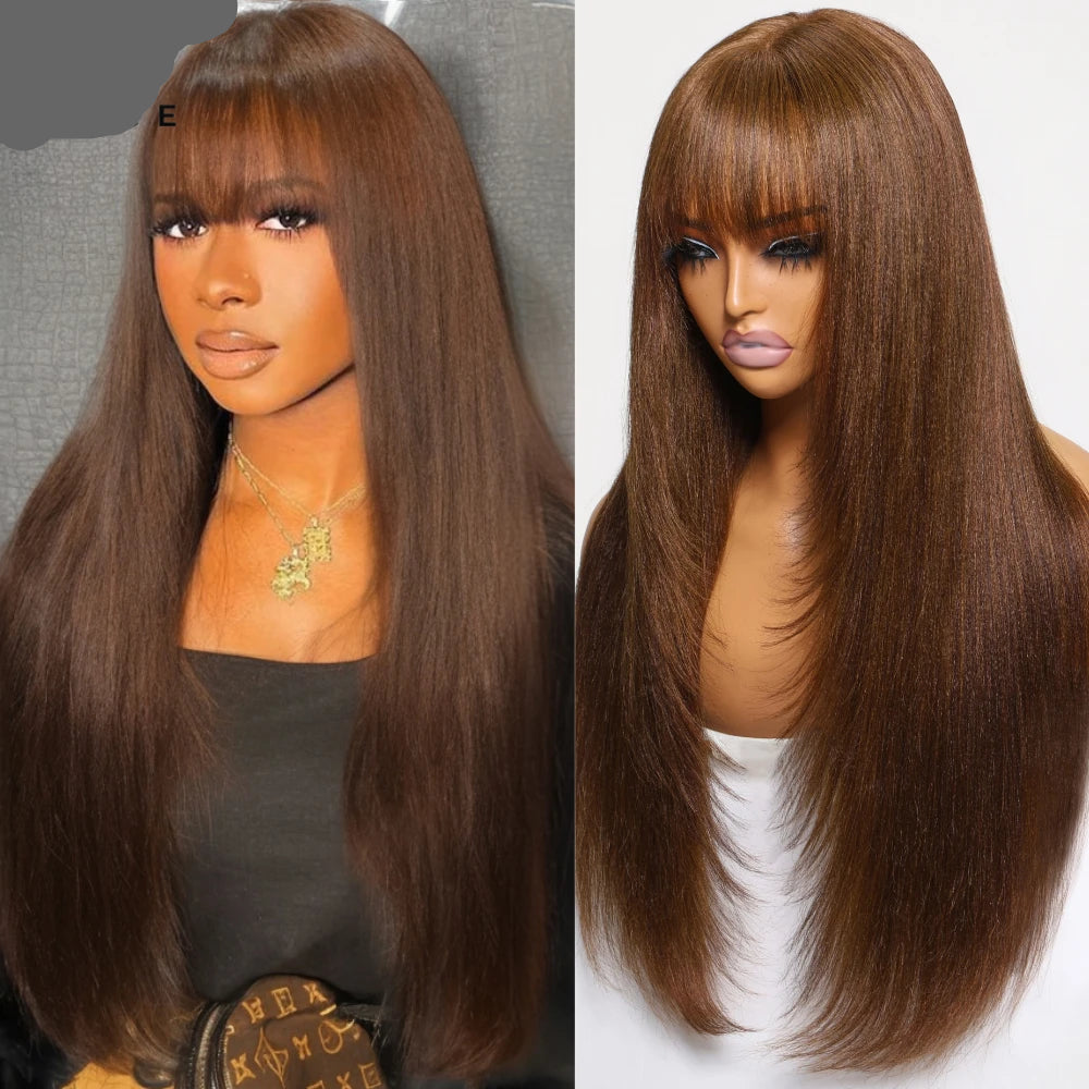 The Yaki Straight Brown Color Human Hair Wig with Bangs is a stunning blend of natural texture and sleek elegance. Made from 100% human hair, this wig features a yaki straight texture that mimics relaxed natural hair, adding volume and movement. The rich brown color enhances warmth and dimension, making it a perfect choice for any skin tone.