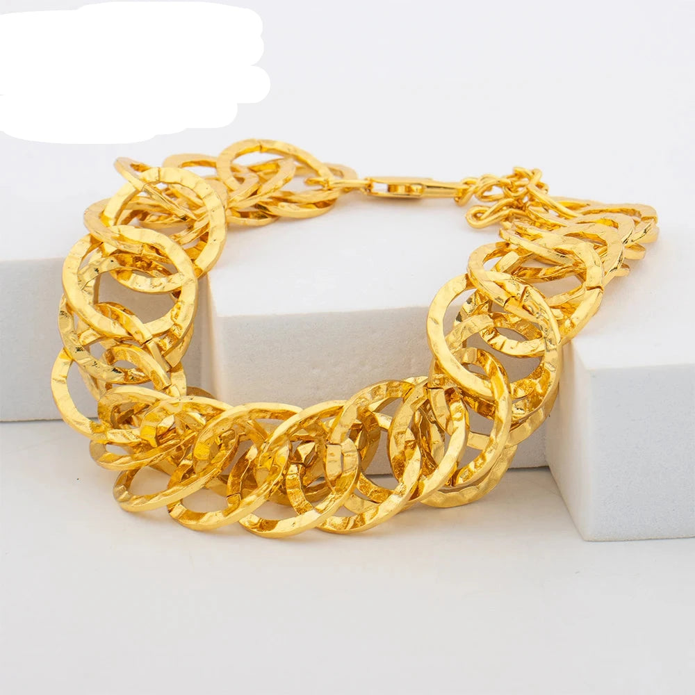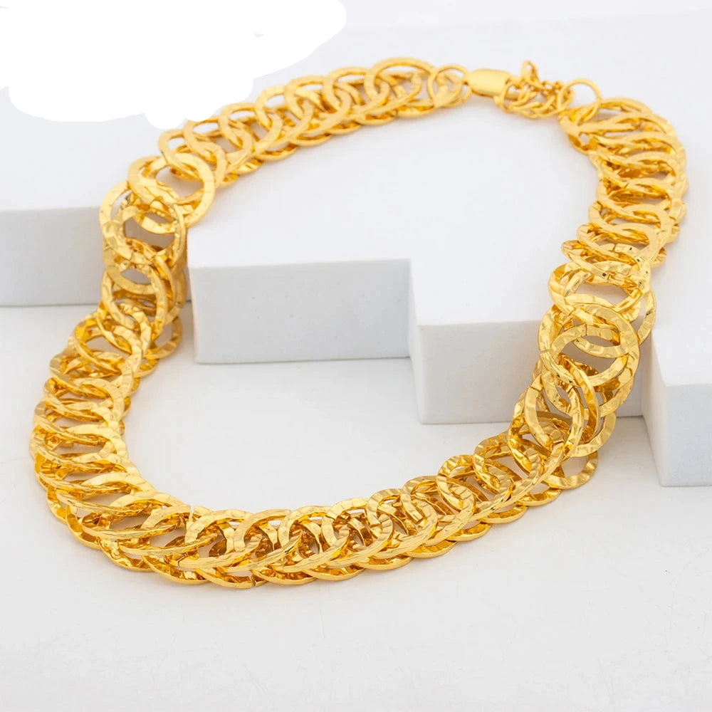 An African fashion gold color jewelry set typically features bold, intricate designs inspired by African culture and artistry. Crafted with a gold-tone finish, the set often includes statement necklaces, earrings, bracelets, and rings. Known for its vibrant patterns and eye-catching appeal, this jewelry set adds elegance and cultural richness to both traditional and modern outfits.