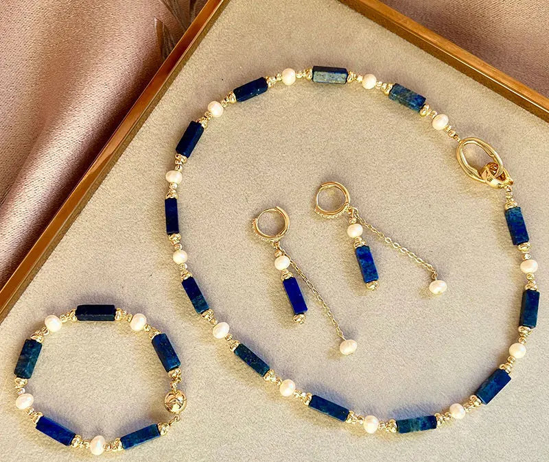 Elevate your elegance with this Natural Freshwater Pearl & Lapis Lazuli Jewelry Set. Featuring rich blue tones and lustrous pearls, the set includes a necklace, bracelet, and earrings. A harmonious blend of nature’s beauty and timeless style ideal for formal events or meaningful gifting.