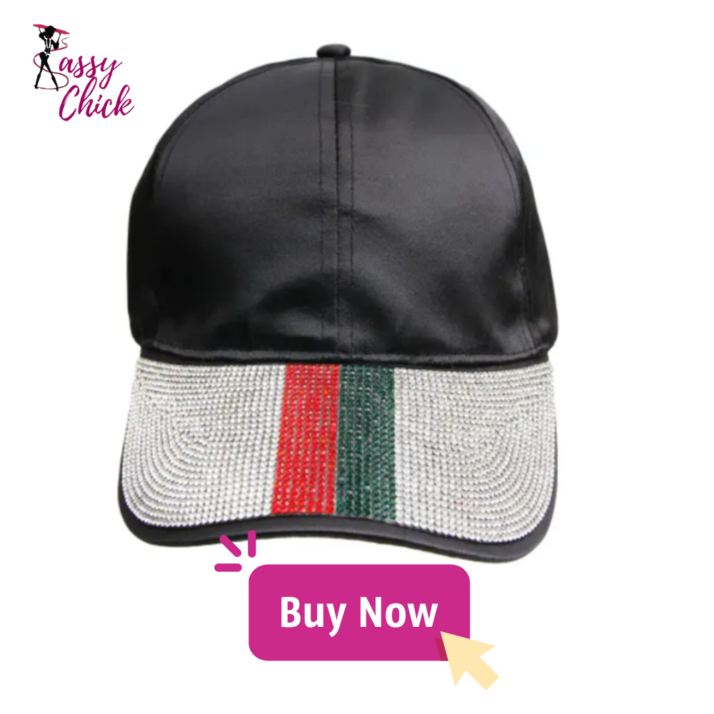 This Black Satin Hat with Green and Red Stripe Rhinestone Brim will be a comfy and classic choice for a perfect day in the sun. Black Satin Hat with Green and Red Stripe