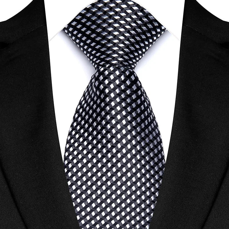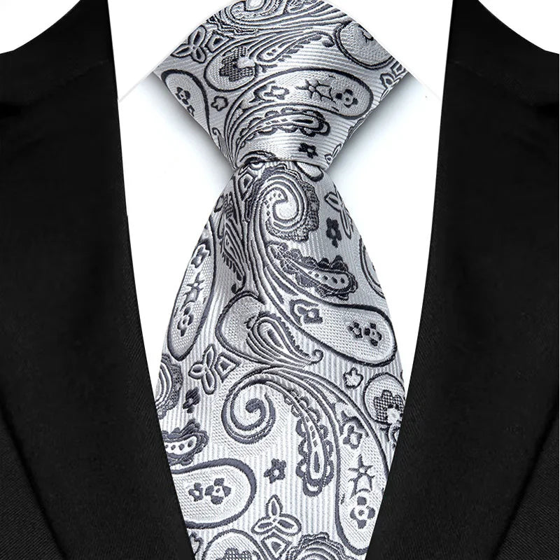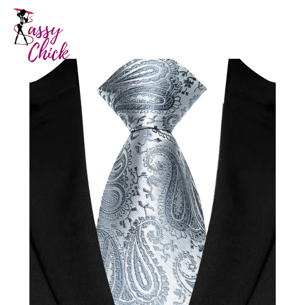 Elevate your formal style with this Gray Silver Color Jacquard Woven Necktie. Made with premium silk, it includes a matching pocket square and cufflinks. The refined jacquard weave offers a sophisticated texture, making it perfect for business, weddings, or upscale events. A timeless gift idea.