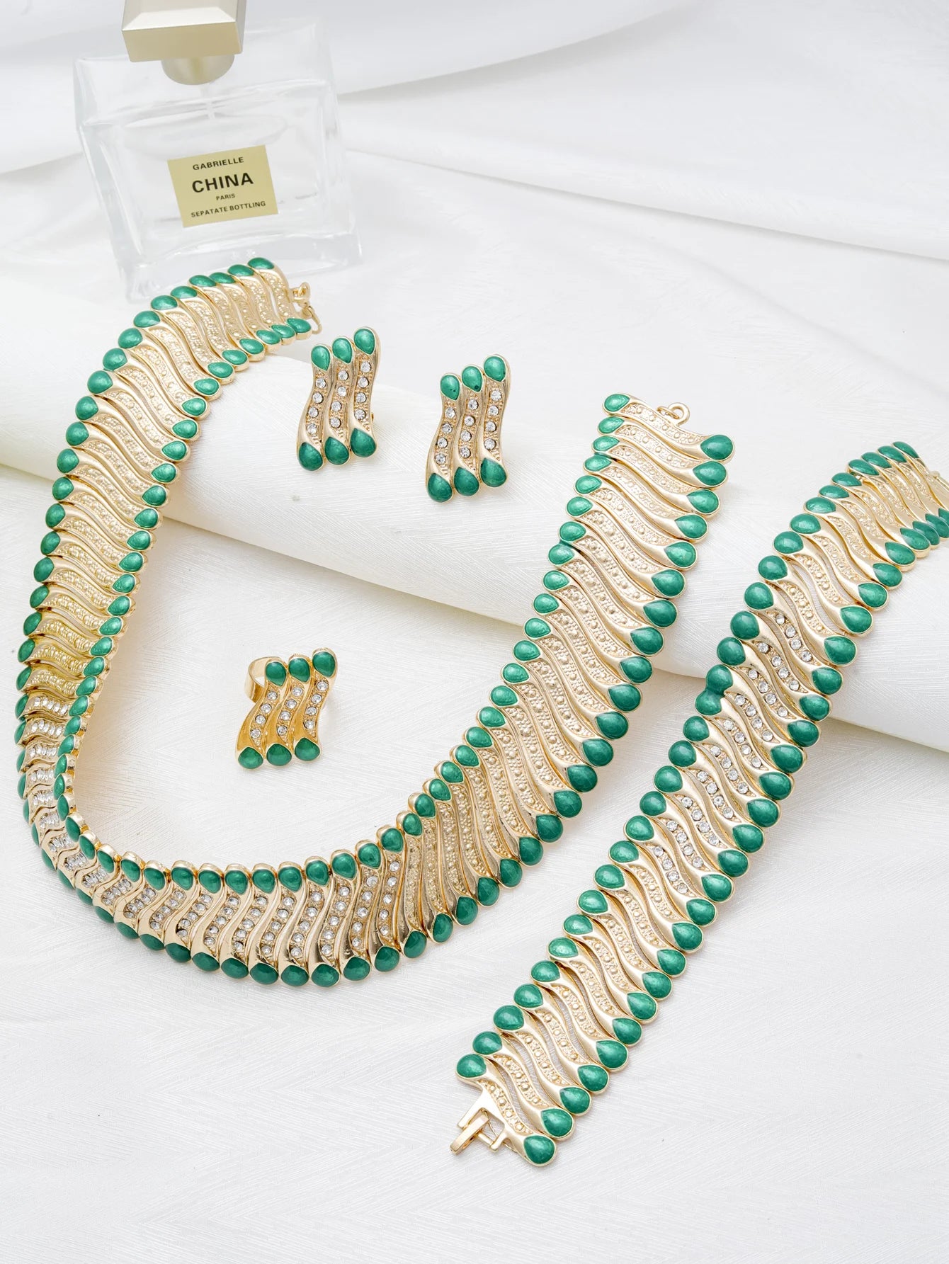 Add a pop of glamour to your special day with this Green Enamel Crystal Wedding Jewelry Set. Featuring a dazzling necklace, matching earrings, and bracelet, each piece is adorned with vibrant green enamel and shimmering crystals perfect for weddings, proms, or elegant soirées.