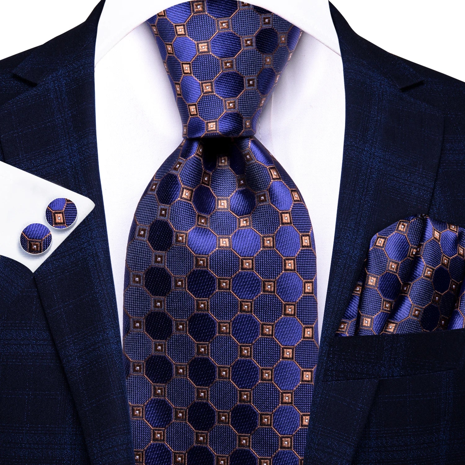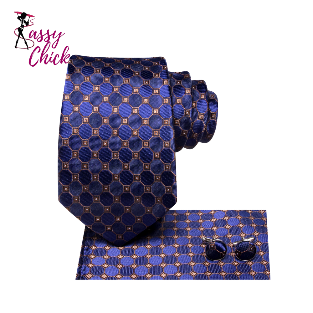 Make a statement with our Navy Blue Gold Plaid Necktie Set. Featuring a classic plaid pattern in rich tones, this silk tie exudes timeless elegance. Includes matching pocket square and cufflinks for a complete, dashing look—perfect for formal events, weddings, or professional wear.