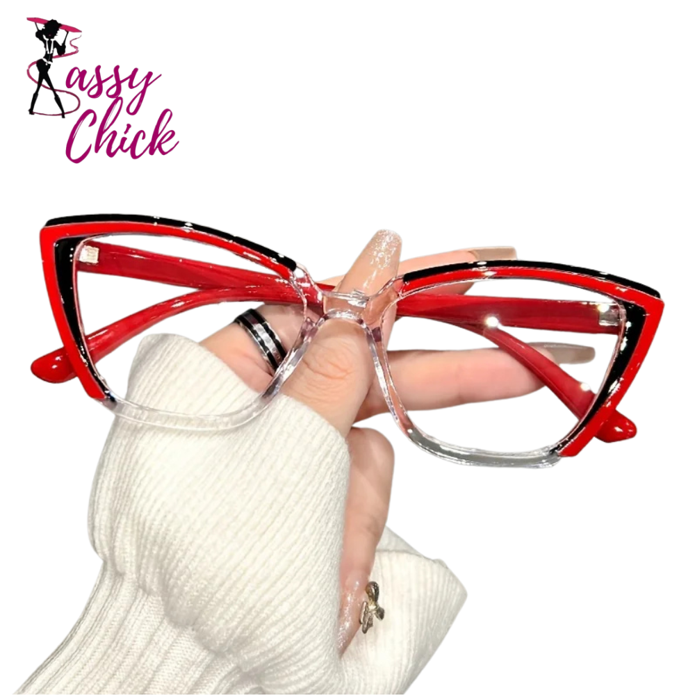 Retro Color Block Cat Eye Clear Lens Glasses Sassy Chick Logo