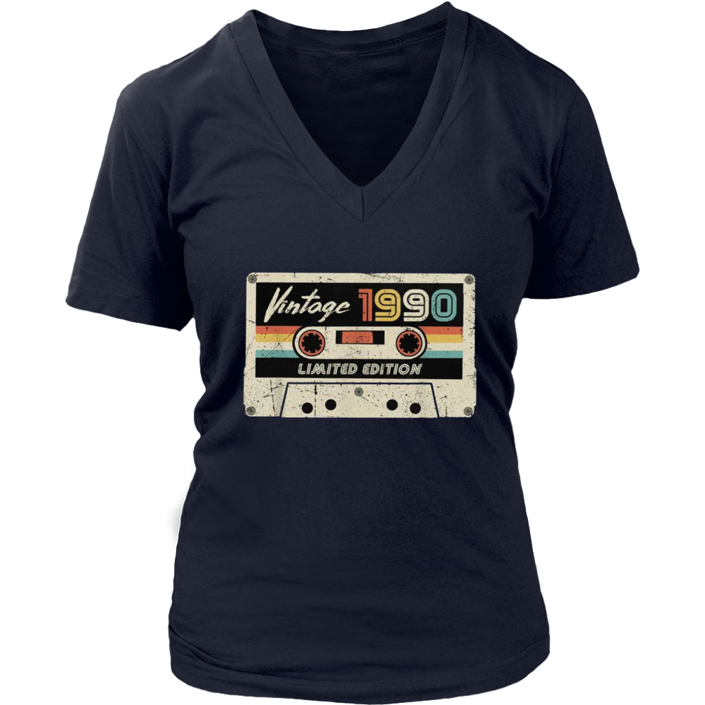 A unique and soft deep V-neck cut tee. This shirt has a semi-relaxed, feminine fit, and flattering short sleeves. A soft tee made to go with everything in your closet. Vintage 1990 V-Neck