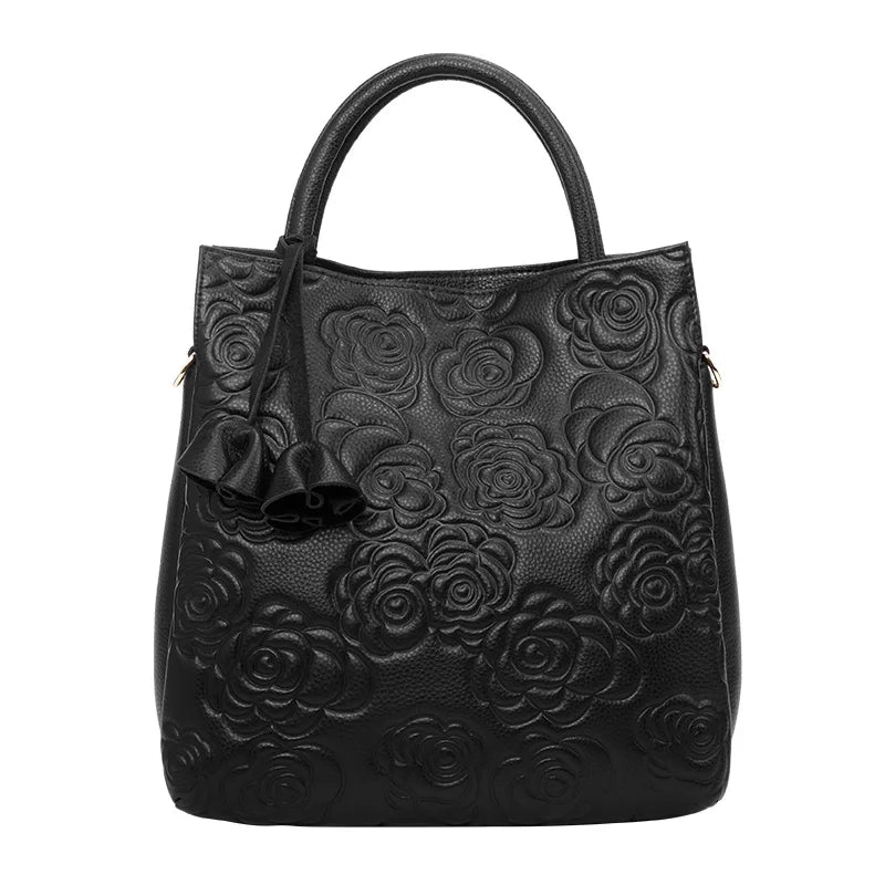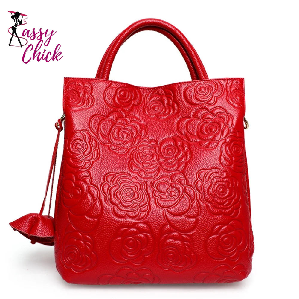 Floral Design Leather Handbag that blends timeless elegance with a touch of nature. Crafted from premium leather, it features delicate floral patterns that add charm and sophistication. Spacious yet stylish, this bag is perfect for work, events, or casual outings, keeping your essentials organized.