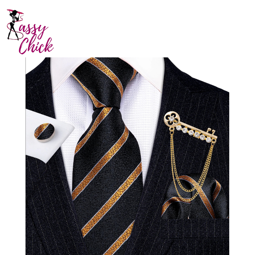 Elevate your style with the Gold Brooches Silk Handkerchief Striped Men Tie Set. Crafted from high-quality silk, this set includes a striped tie, matching handkerchief, and elegant gold brooches. Perfect for weddings, business, or formal occasions, it adds a polished and luxurious finishing touch.