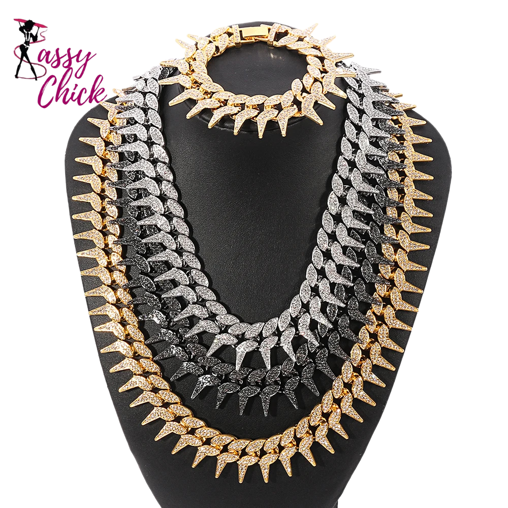 Make a bold statement with this Cuban Hip Hop Rivet Gothic Spiked Charm Jewelry set. Featuring edgy spikes and a rugged chain, it combines urban street style with punk rock flair. Ideal for concerts, parties, or turning heads with your fierce, fashion-forward attitude.