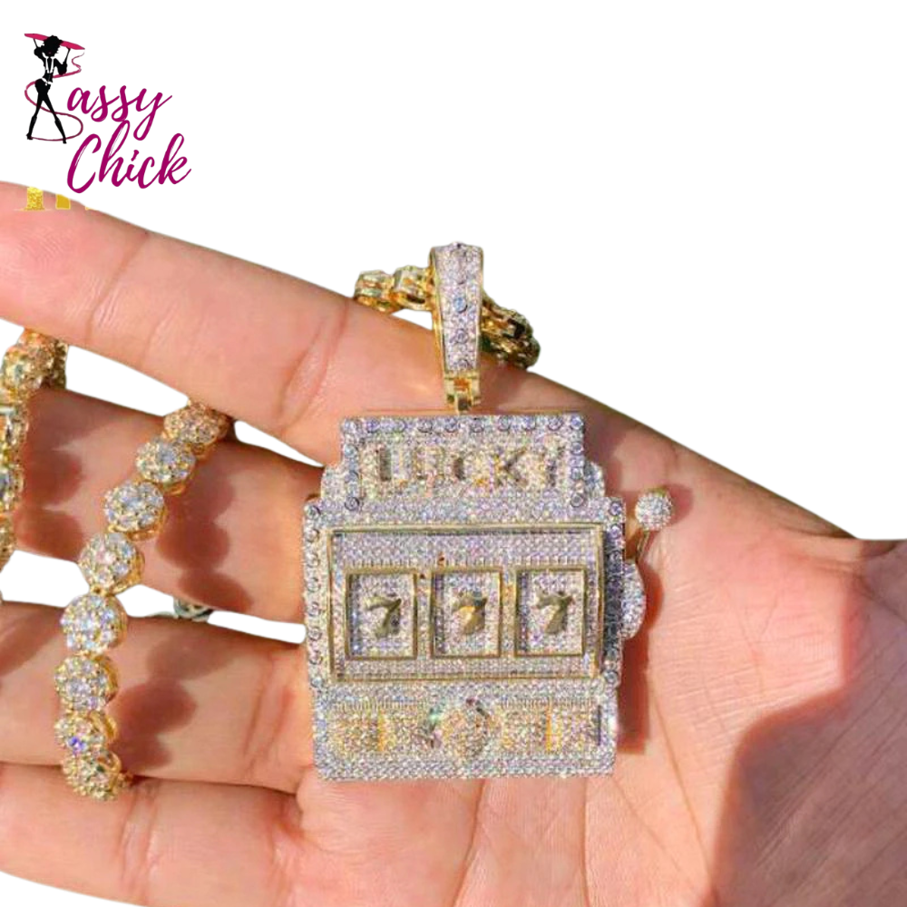 Turn up the luck and the shine with our Iced Out Bling Zircon Lucky 777 Charm Pendant Necklace. Drenched in dazzling CZ stones, this bold piece blends hip hop flair with Vegas vibes. Perfect for making your style pop and your luck sparkle because winners wear 777.