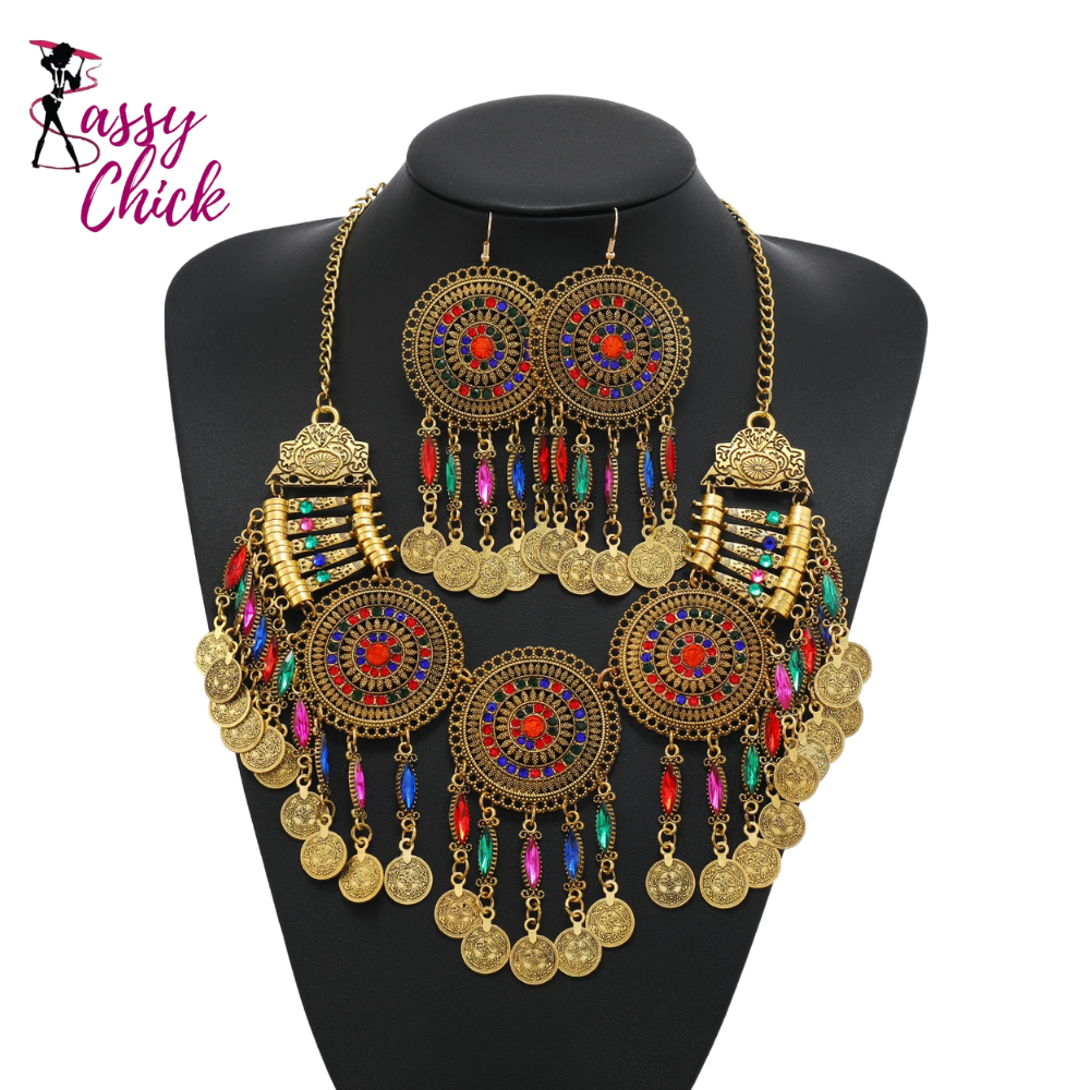 Add a bold statement to your style with this Ethnic Metal Coin Crystal Tassel Tribal Jewelry set. Designed with intricate metal coins, sparkling crystals, and flowing tassels, it brings a unique bohemian and tribal charm. Perfect for festivals, cultural events, or adding a touch of exotic flair to any outfit.
