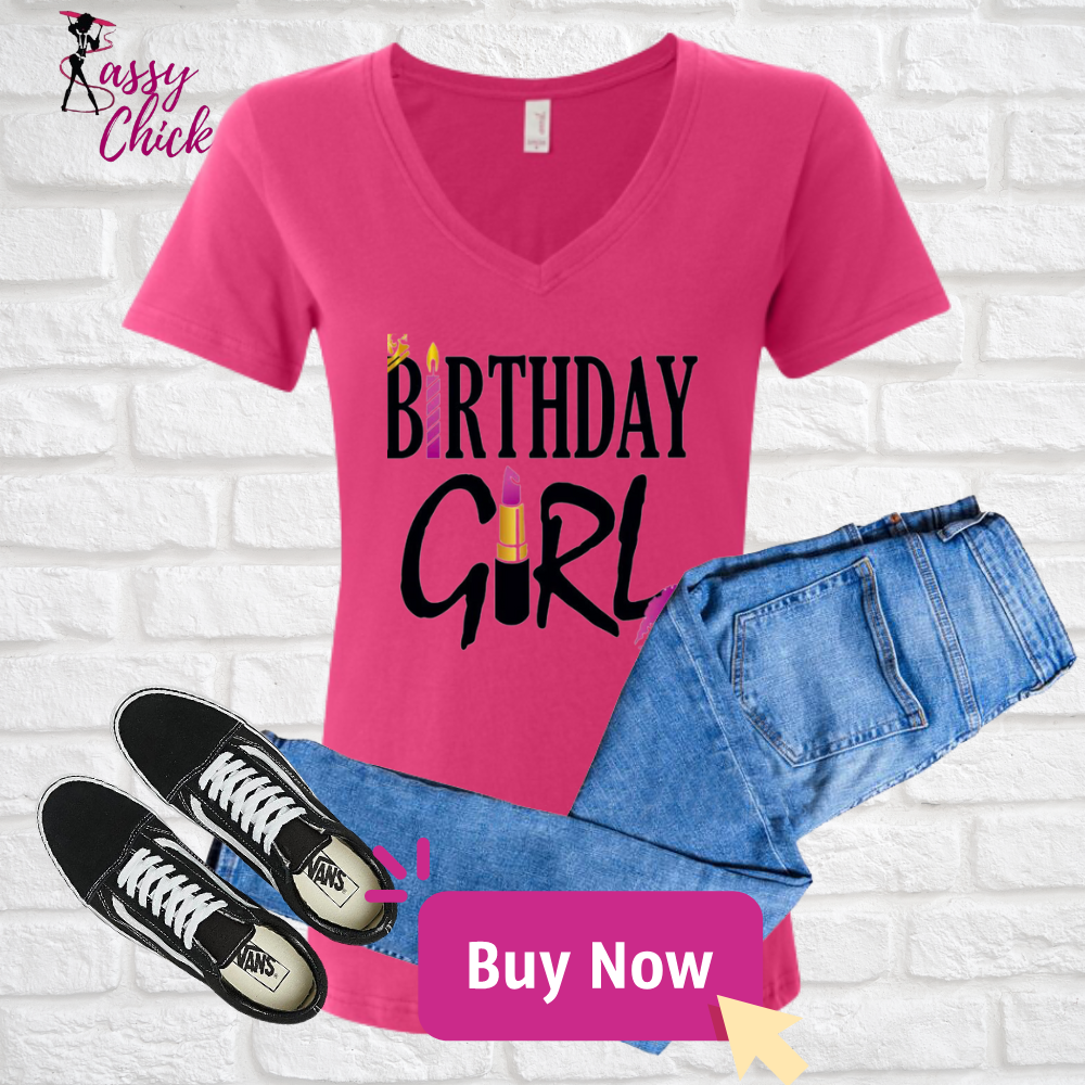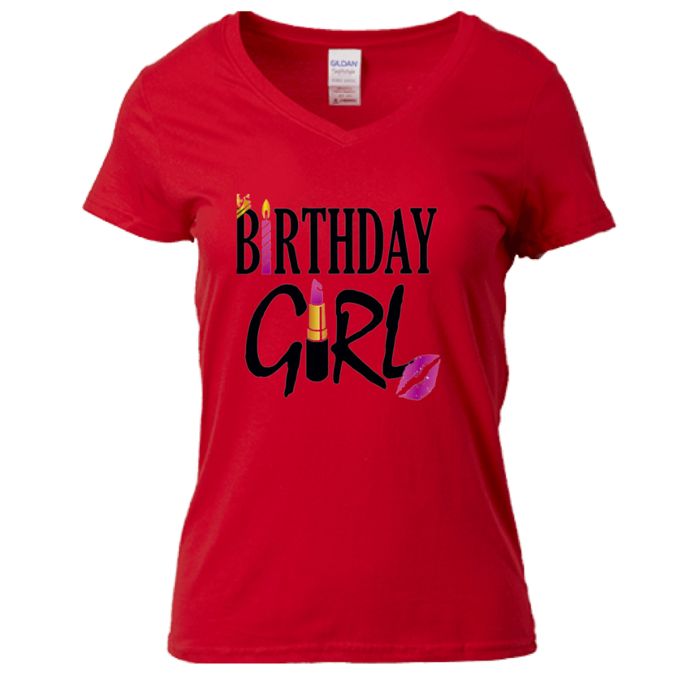 Part of our new relaxed collection, this women v neck jersey t-shirt is available in pink, red, and white in Vinyl. A new modern, relaxed fit for effortless style. Birthday Girl V-neck Shirt