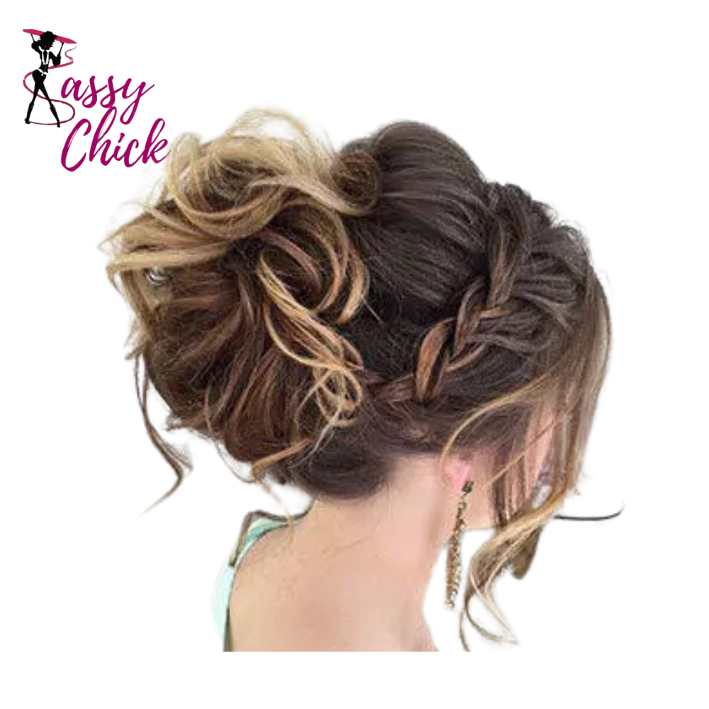 model using Curly Chignon Women Drawstring Ponytail Hairpieces Synthetic  Hair sass chick logo